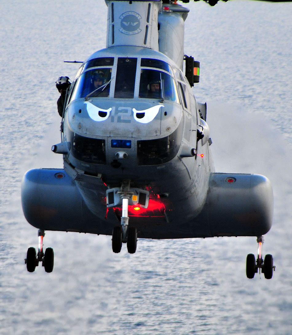 PACIFIC OCEAN (Dec. 6, 2008) A Marine CH-46E helicopter assigned to the "Evil Eyes" of Marine Medium Helicopter Squadron (HMM) 163 (REIN) lands aboard the amphibious transport dock ship USS New Orleans (LPD 18). New Orleans is on a certification exercise as part of the Boxer Expeditionary Strike Group in preparation for an upcoming deployment. (U.S. Navy photo by Mass Communication Specialist 2nd Class Daniel Barker)