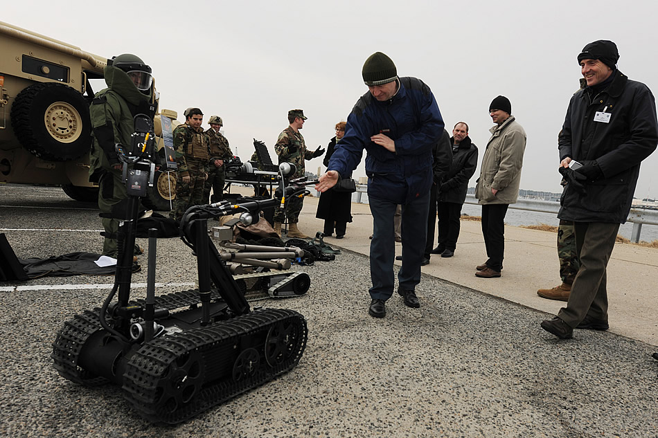 Members of NATO reserve force interact with an explosive ordnance disposal manned transportable robot , Jan. 28, 2011, during a tour of Navy Expeditionary Combat Command. The NATO personnel visited the command to meet with sailors from the expeditionary community and see how the command incorporates reservists into the expeditionary force. U.S. Navy photo by Petty Officer 2nd Class Paul D. Williams