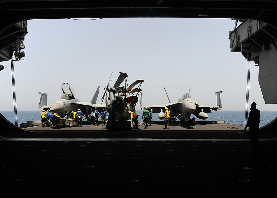 ARABIAN GULF (May 29, 2012) Sailors and Marines prepare to elevate aircraft from the hangar bay to the flight deck aboard the aircraft carrier USS Enterprise (CVN 65). Enterprise is deployed to the U.S. 5th Fleet area of responsibility conducting maritime security operations, theater security cooperation efforts and support missions as part of Operation Enduring Freedom. (U.S. Navy photo by Mass Communication Specialist Seaman Gregory White)