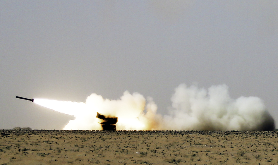 An M142 High Mobility Artillery Rocket System assigned to the 41st Fires Brigade, Fort Hood, Texas, fires a rocket during a live fire at the Udairi Range Complex, Camp Buehring, Kuwait, March 13, 2014. The Headquarters and Headquarters Battery, 3rd Battalion, 16th Field Artillery Regiment, 2nd Armored Brigade Combat Team, 4th Infantry Division provided radar coverage as Company C, 2nd Battalion, 8th Infantry Regiment, 2nd ABCT provided forward observers to the live fire. (U.S. Army Photo by Sgt. Marcus Fichtl, 2nd ABCT PAO, 4th ID)