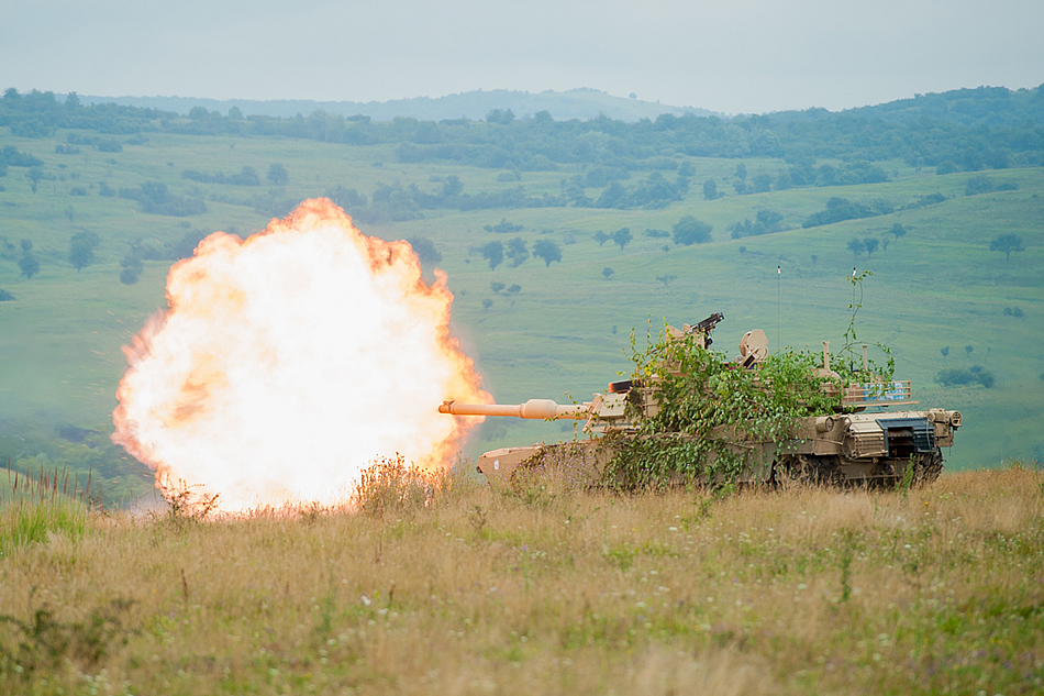 Soldiers with Delta Company, 3rd Battalion, 116th Cavalry Brigade Combat Team, conduct a live fire exercise in an M1A2 Abrams Tank during Exercise Saber Guardian 16 at the Romanian Land Force Combat Training Center in Cincu, Romania, Aug. 2. Saber Guardian is a multinational military exercise involving approximately 2,800 military personnel from ten nations including Armenia, Azerbaijan, Bulgaria, Canada, Georgia, Moldova, Poland, Romania, Ukraine and the U.S. The exercise is designed to build multinational, regional and joint partnership capacity by enhancing military relationships, exchanging professional experiences, and improving interoperability between the land forces from the participating countries. (Photo by Staff Sgt. Kyle J. Warner)
