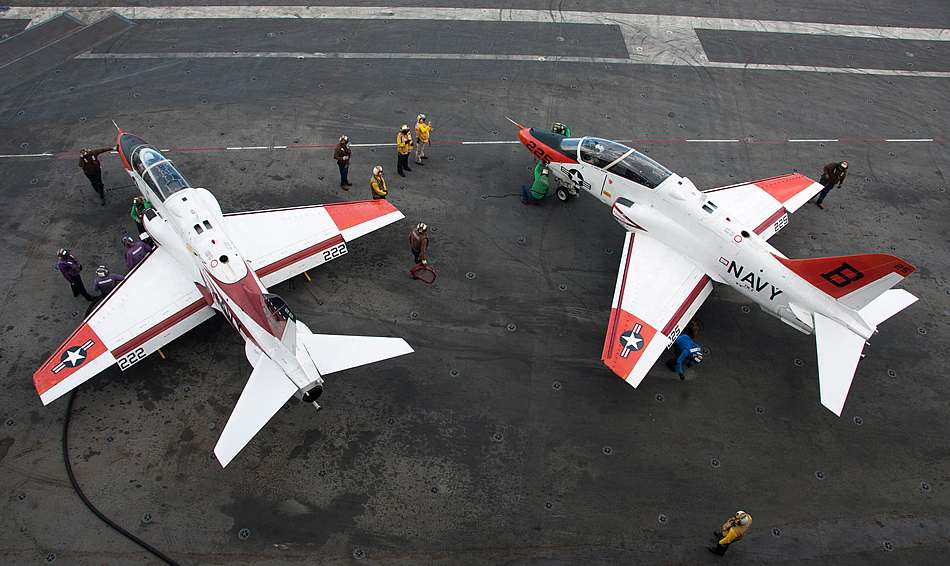 ATLANTIC OCEAN (Aug. 30, 2016) A T-45C Goshawk attached to the "Golden Eagles" of Training Squadron (VT) 22, left, and a T-45C Goshawk attached to the "Redhawks" of Training Squadron (VT) 21 wait to be re-fueled on the flight deck of the aircraft carrier USS George H.W. Bush (CVN 77). Training Squadrons 21 and 22 provide first-time aircraft carrier launches and recoveries for student pilots. Bush is underway conducting routine training and qualifications in preparation for an upcoming deployment. (U.S. Navy photo by Mass Communication Specialist 2nd Class Ryan Seelbach)