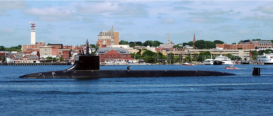 GROTON, Conn. (June 15, 2007) - Fast-attack submarine USS Seawolf (SSN 21) sails past downtown New London as she makes her way out of the Thames River and into the Long Island Sound. The submarine departed Naval Submarine Base New London for the last time on her way to a new homeport at Naval Base Kitsap, Bangor, Wash. Seawolf, commissioned in 1997, is relocating after 10 years of service as part of the submarine force realignment process. U.S. Navy photo by Mass Communication Specialist 1st Class Ira J. Elinson