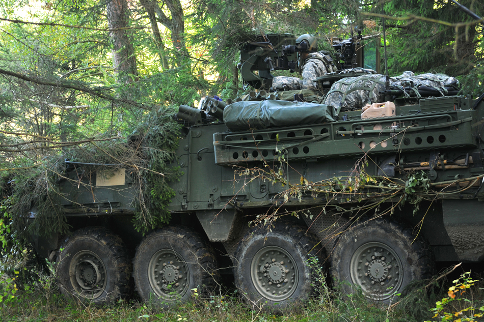 A U.S. Army soldier pulls security in a Stryker armored vehicle during a decisive action training environment exercise, Saber Junction 2012, at the Joint Multinational Readiness Center in Hohenfels, Germany, Oct. 17, 2012. Saber Junction 2012, the U.S. Army Europe's premier training event, is a large-scale, joint, multinational, military exercise involving thousands of personnel from 19 different nations and hundreds of military aircraft and vehicles. It is the largest exercise of its kind that U.S. Army photo by Spc. Jordan Fuller