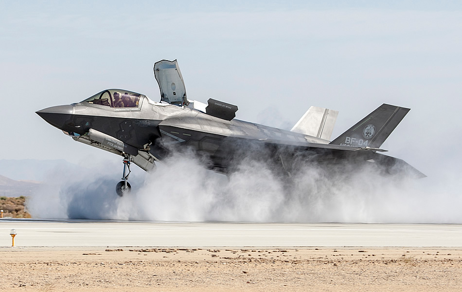 FORT WORTH, Texas (July 30, 2014) The Lockheed Martin F-35B Joint Strike Fighter completes a required wet runway and crosswind testing at Edwards Air Force Base, Calif., an important program milestone enabling U.S. Marines Corps initial operational capability certification. (U.S. Navy photo)