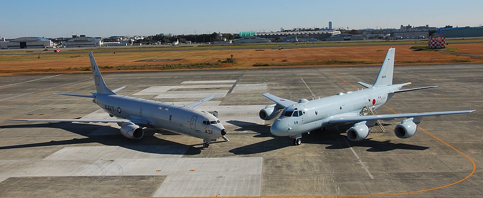 NAVAL AIR FACILITY ATSUGI, Japan (Nov. 19, 2014) A U.S. Navy P-8A Poseidon assigned to the Mad Foxes of Patrol Squadron (VP) 5 is on display next to the newest maritime patrol asset of the Japan Maritime Self-Defense Force, the Kawasaki P-1. VP-5 is forward deployed to the U.S. 7th Fleet area of responsibility conducting theater anti-submarine warfare operations and joint interoperability efforts with the Japan Maritime Self-Defense Force. (U.S. Navy photo by Mass Communication Specialist 2nd Class Douglas G. Wojciechowski)