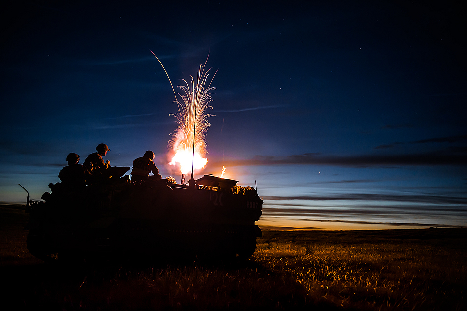 Soldiers from the First Fusilier Battlegroup fire the L16A2 81mm mortar from the back of an FV 430 armoured vehicle during live fire training ranges on the BATUS training area. Photo by Corporal McAllister (RLC) Crown copyright 2015