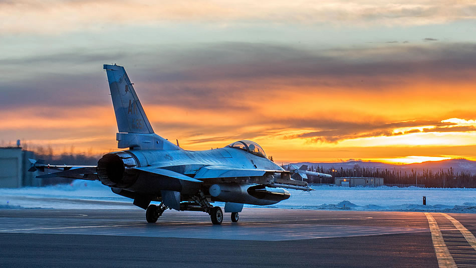 An F-16 Fighting Falcon with the 18th Aggressor Squadron prepares to take off from Eielson Air Force Base, Alaska, shortly after sunrise Jan. 24, 2016, in transit to Kadena Air Base, Japan, to participate in training exercises. More than 150 maintainers from the 354th Fighter Wing will keep the Aggressors in the air and prepare U.S. Airmen, Sailors and Marines for contingency operations along with coalition partners in the Pacific theater. (U.S. Air Force photo/Staff Sgt. Shawn Nickel)