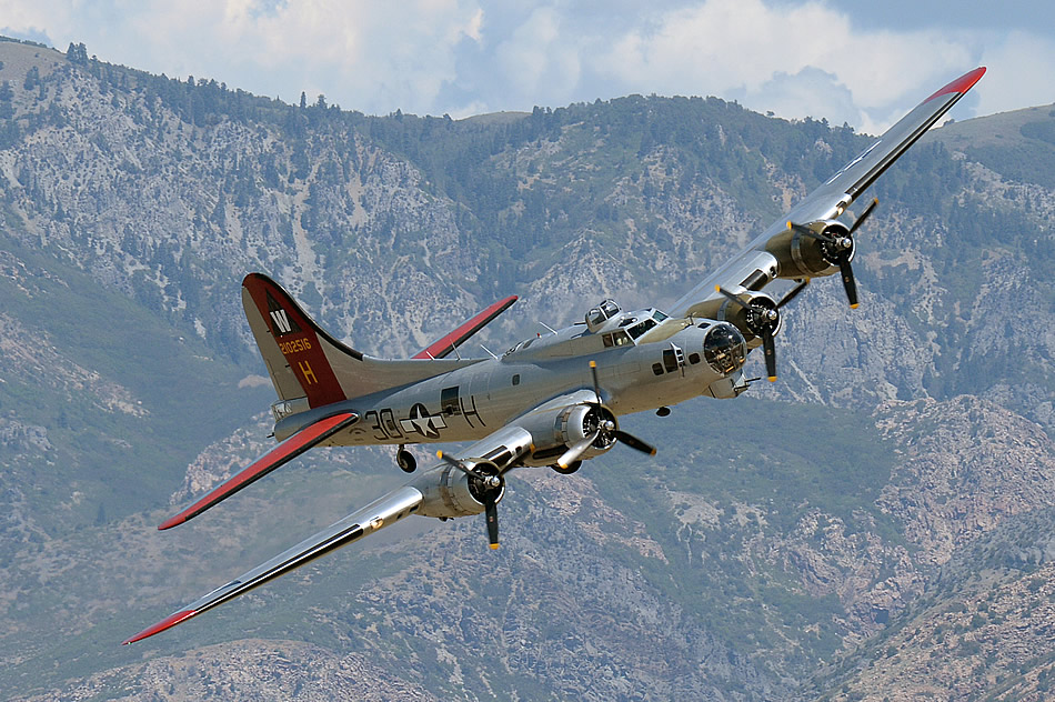 “Aluminum Overcast,” Experimental Aircraft Association’s B-17, banks right above Hill Air Force Base, Utah, Thursday, Aug. 13, 2015. EAA’s B-17 is painted to resemble B-17G #42-102515 of the 398th Bombardment Group (Heavy) that flew from RAF Nuthampstead, U.K., during World War II. That aircraft was shot down over Le Manior, France on Aug. 13, 1944, during its 34th combat mission. (U.S. Air Force Photo by R. Nial Bradshaw)